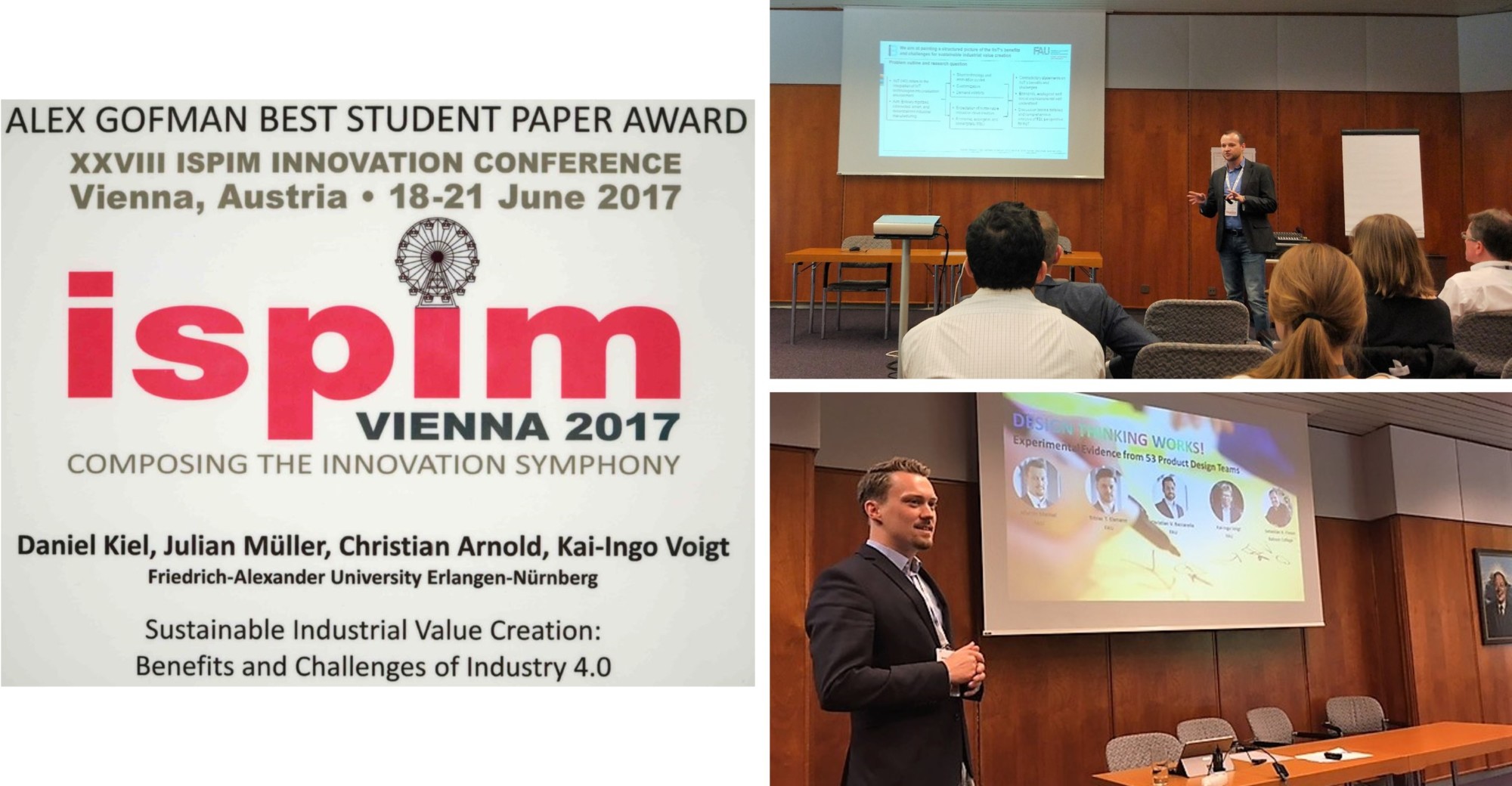 The Chair of Industrial Management presented two recent research papers at the renowned innovation conference of the International Society for Professional Innovation Management (ISPIM) in Vienna. Martin Meinel talked about how „Design Thinking works! Experimental Evidence from 53 Product Design Teams“, a paper co-authored by Tobias Eismann, Dr. Christian Baccarella, Prof. Dr. Kai-Ingo Voigt, and Prof. Dr. Sebastian Fixson from Babson College. Daniel Kiel discussed research findings on „Sustainable Industrial Value Creation: Benefits and Challenges of Industry 4.0“. The chair is particularly pleased that this paper, co-authored by Julian Müller, Christian Arnold, and Prof. Dr. Kai-Ingo Voigt, was honoured with the Alex Gofman Best Paper Award. It has been the second year in a row now that the ISPIM appreciated the chair‘s research activities with this outstanding award.