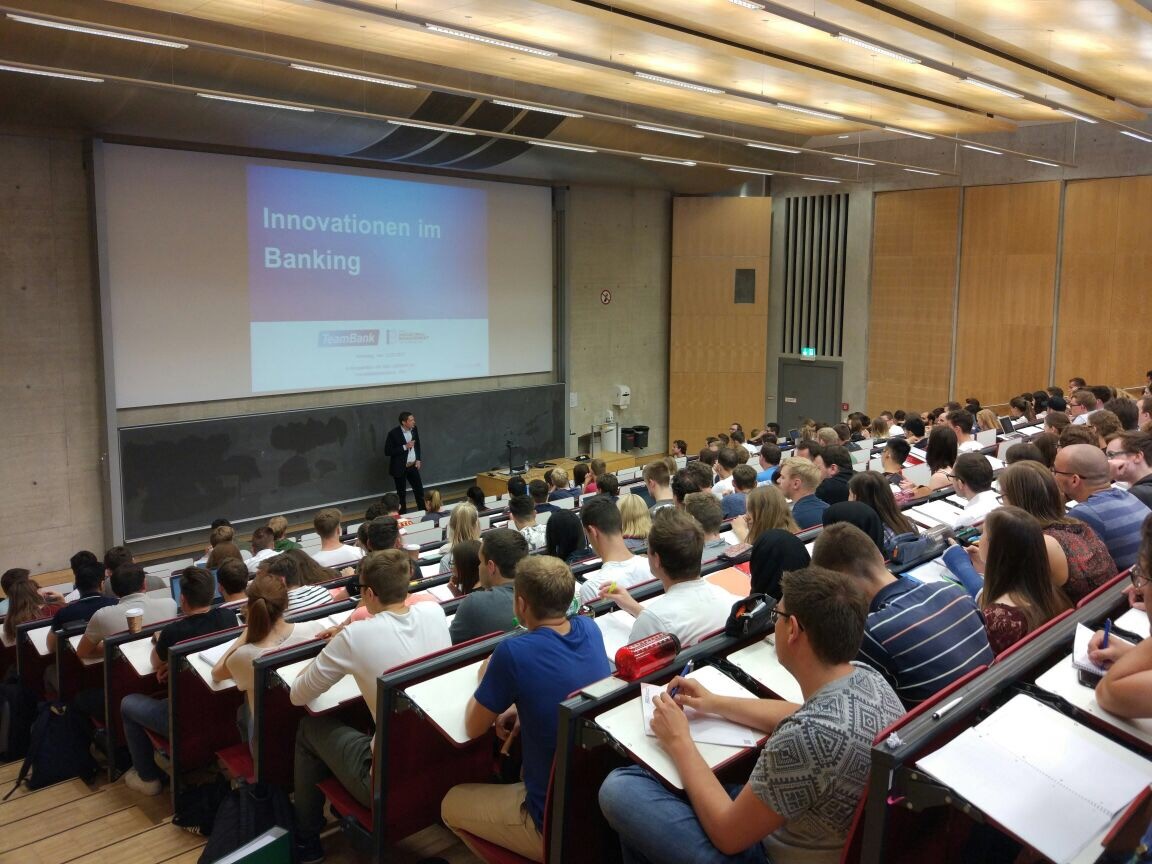 The Chair of Industrial Management welcomed Felix Schaffelhofer, Head of Strategy Development at Teambank, for a guest lecture on the topic “Innovation in the banking sector”. Mr. Schaffelhofer and his colleague Daniela Leistner outlined today’s challenges for banks in a volatile business environment and shared interesting insights into future trends in the banking sector. Rounding up the presentation, numerous students used the opportunity to discuss their questions with Mr. Schaffelhofer. Prof. Voigt and his team highly appreciate his passionate engagement. The Chair is looking forward to welcoming Mr. Schaffelhofer and his team again soon.