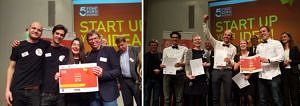 This year’s highlight of the 5-Euro-Business took place in the Marmorsaal of the Presseclub Nürnberg at 29 January 2018. The seminar, which was supervised and co-organized by Dr. Christian Arnold, resulted in nine teams presenting their ideas and companies in the context of a festive closing ceremony. In detail, they hold a short presentation about their products and services and justified themselves at exhibition stands designed by the teams themselves. At the end, a high-quality jury had the difficult task to choose a winner. Prof. Voigt, a longstanding judge and supporter of the 5-Euro-Business, had the pleasure to present the award for the second place to the team openspirits GbR (see left), which was only beaten by the winner team Pflanzkalender GbR (see right).