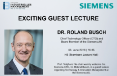 Prof. Voigt and the entire Chair of Industrial Management are pleased to announce a special guest lecture by the Siemens Chief Technology Officer (CTO), Dr. Roland Busch, who will give interesting insights in the field of Technology and Innovation Management at the Siemens AG. We are also looking forward to a compelling discussion, which you are cordially invited to join. The guest lecture takes place on Wednesday, June 6th, between 16:45-18:15 in the Teambank Lecture Hall (H5) .
