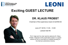 Prof. Voigt and the entire Chair of Industrial Management are pleased to invite you to an exiciting guest lecture by Dr. Klaus Probst, Chairman of the supervisory board of LEONI AG. Dr. Probst will talk about the future of mobility, thereby, emphasizing the German automotive industry and the role of Leoni. We are looking forward to receiving Dr. Probst at FAU and to having a compelling discussion in plenary. The guest lecture will take place on Thursday, June 21th 2018, 11:30-13:00 in the Lecture Hall H6 (School of Business and Economics). All interested parties are more than welcome to this exciting lecture!