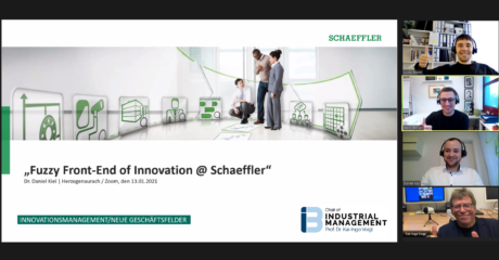Once again (but for the first time digitally), the Chair of Industrial Management had the pleasure to welcome Dr. Daniel Kiel, Innovation Manager at Schaeffler and Alumini of the Chair of Prof. Voigt, for a guest lecture on the topic of innovation management at Schaeffler. Schaeffler, founded in 1982 in Herzogenaurach, is a global automotive and industrial supplier. Schaeffler is making a decisive contribution to mobility with its high-precision components and systems in engine, transmission, and chassis applications, in addition to rolling and plain bearing solutions for a large number of industrial applications.