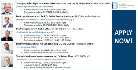 This summer term, the Chair of Industrial Management by Prof. Voigt was once again able to gain leading personalities from renowned international companies for our seminars. Do not miss the opportunity to work together with these outstanding leaders and discuss current issues. The application period for the upcoming summer term 2021 has already started.