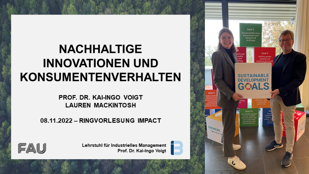 On November 8th, Prof. Dr. Kai-Ingo Voigt and Lauren Anne Mackintosh will hold a guest lecture for the “IMPACT Lecture Series: Entrepreneurial Solutions to Social Problems” from Prof. Dr. Markus Beckmann, Chair of Corporate Sustainability Management.