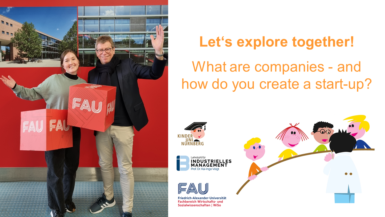 Why do companies exist? And what else is there to research about them? Prof. Dr. Kai-Ingo Voigt and Hannah Altenburg from the Chair of Industrial Management invite anyone from 8 to 12 years to find out more about why companies are useful in our FAU KinderUni seminar. How do companies come into being? We are also doing research in this field here at the WiSo in Nürnberg. We want to show you how and why new companies, so-called “start-ups”, are founded. We promise already now: It will be exciting!