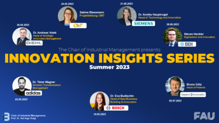 We proudly present our “Innovation Insights Series 2023,” which features exceptional guest speakers from various industries. This semester, besides the regular lectures our students enrolled in “Innovation” (Bachelor), “Technology and Innovation Management” (Master), and “Industrielles Management” (Master) courses will have the unique opportunity to learn from industry experts and gain valuable insights into important innovation and technology topics.