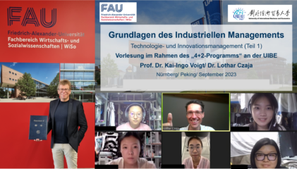 From September 11th to 15th, Professor Dr. Kai-Ingo Voigt und Dr. Lothar Czaja once again gave an online guest lecture for Chinese students of the University of International Business and Economics (UIBE), our longstanding partner university in Beijing. Since many years, our lecture is central part of the 4+2 program, which is a joint study program of FAU and UIBE.