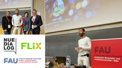 On November 14th, Daniel Krauss, founder and CIO of Flix SE, delivered an incredible kick-off to the sixth NueDialog at FAU Wiso, filling the auditorium with excitement and motivation. Hosted by, Prof. Kai-Ingo Voigt, Daniel shared insights into the entrepreneurial world, drawing from his own journey and encouraging all young minds in the room to be courageous and resilient on their own path. His words set the tone for what promises to be another impactful NueDialog, packed with learning, inspiration and networking.