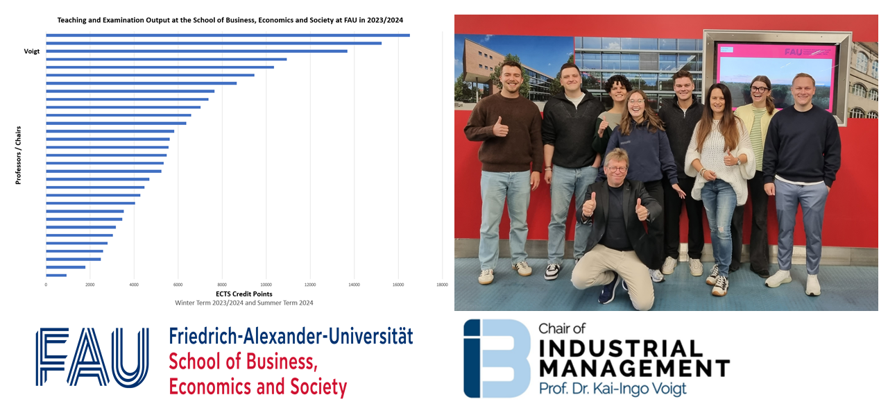 Professor Voigt and his team are delighted to share that the Chair of Industrial Management once again delivered an exceptionally high teaching output for WiSo students at FAU during the past academic year. Based on the latest faculty statistics for the winter term 2023/2024 and the summer term 2024, our Chair’s teaching and examination performance amounted to around 14.000 ECTS credit points in total—remaining at the same strong level as in previous years and well above the faculty’s average per Chair.